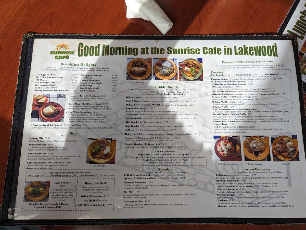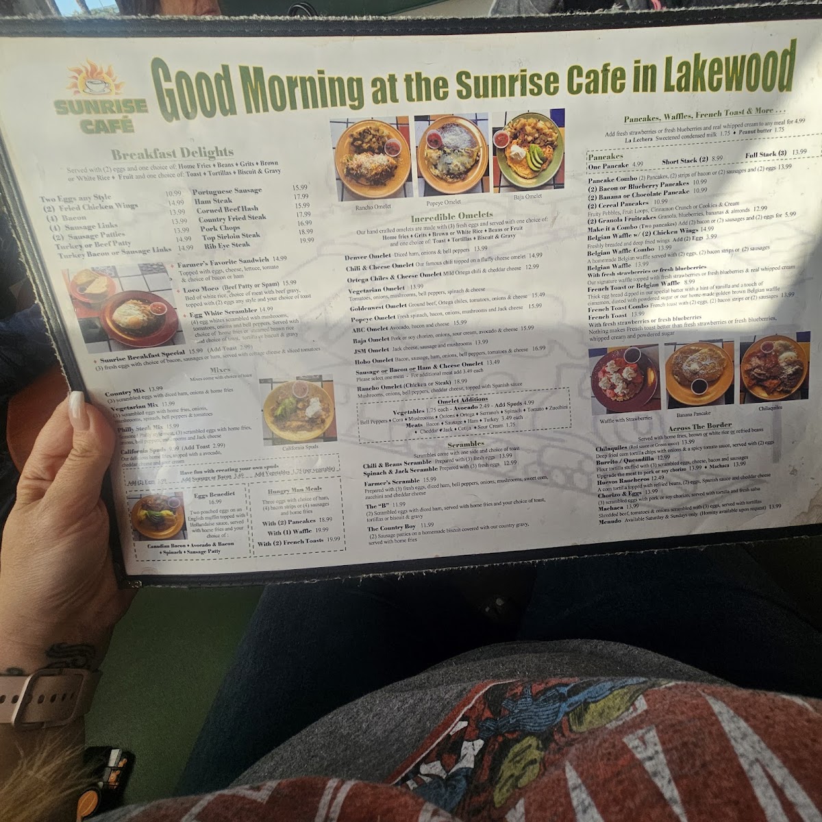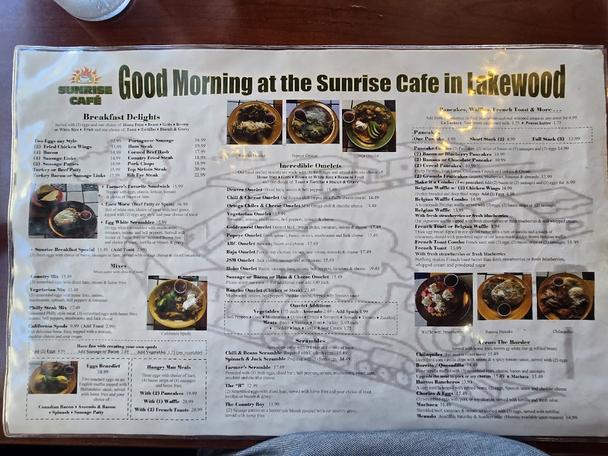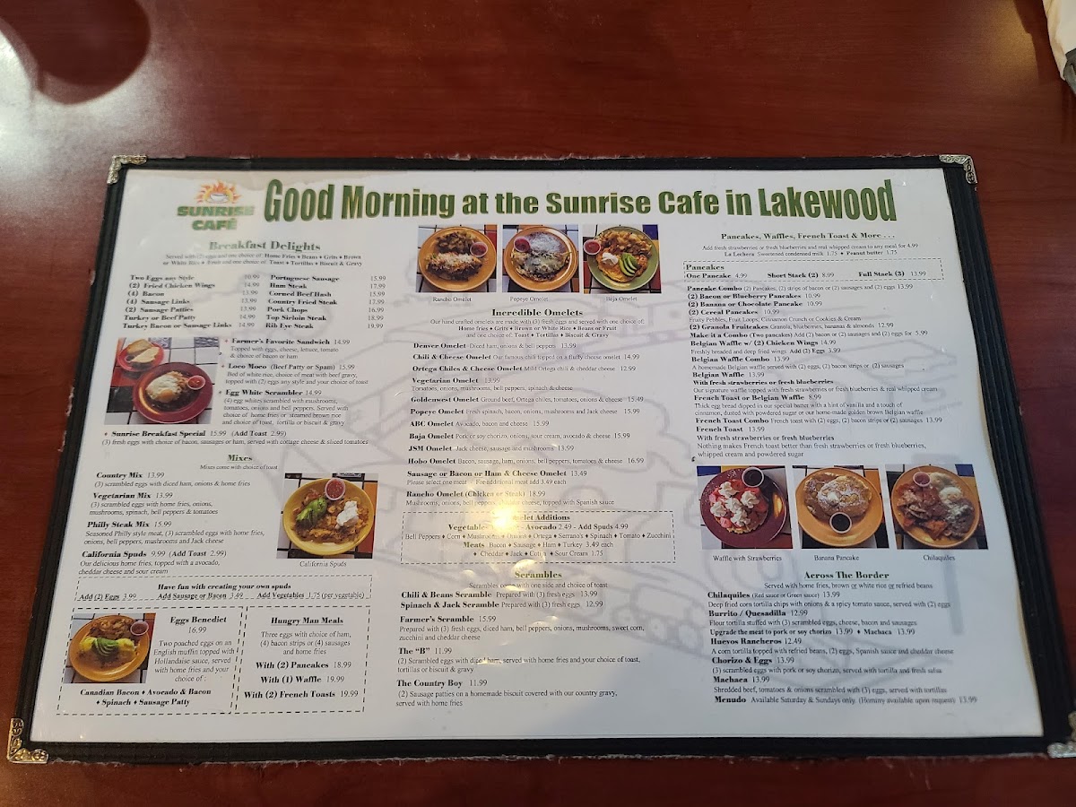 The menu at Sunrise Café - Lakewood offers a diverse selection of American-style breakfast and casual dining options, suitable for breakfast, brunch, or light meals throughout the day. The menu is organized into several groups, making it easy to find a variety of dishes and sides.