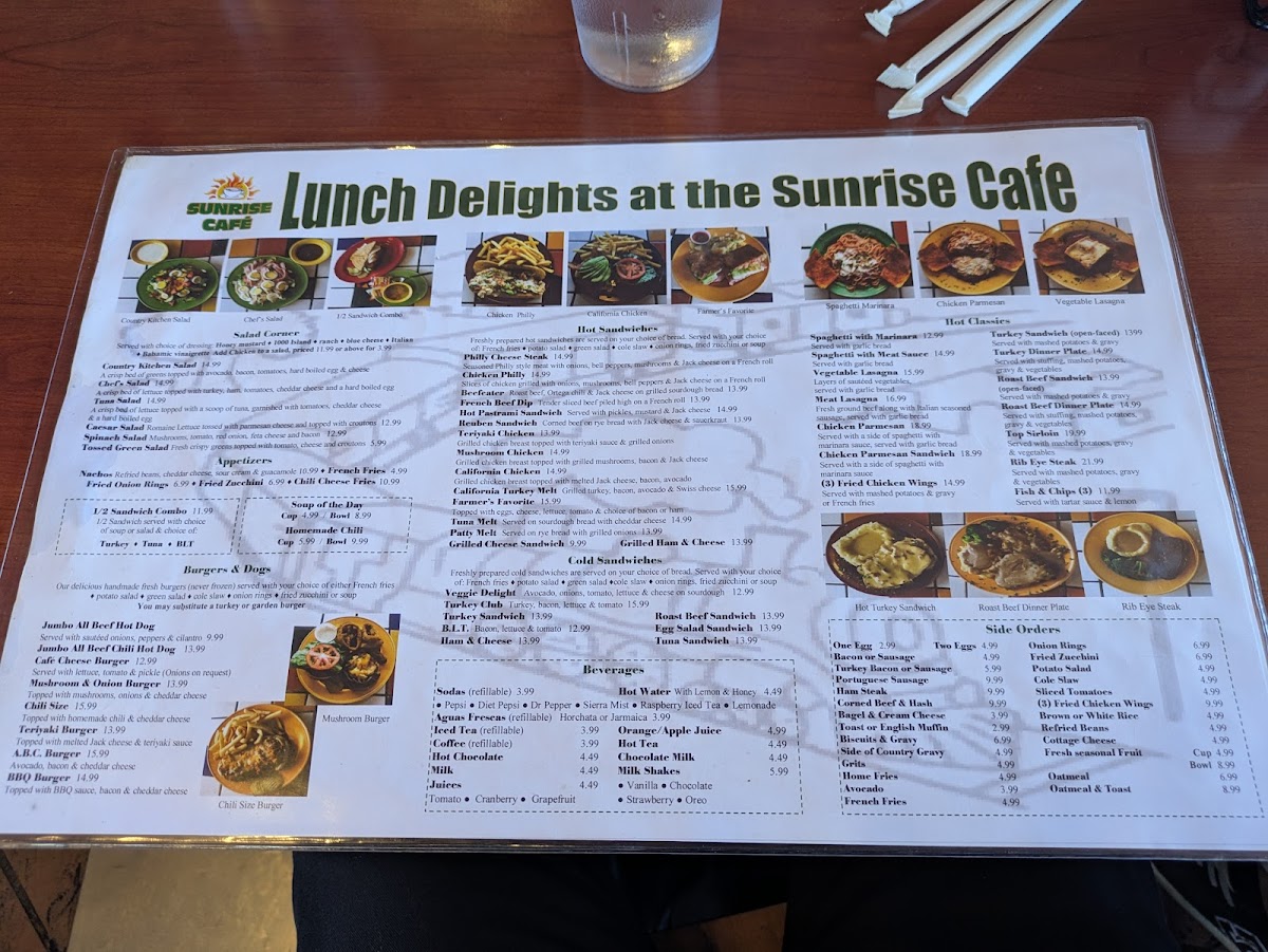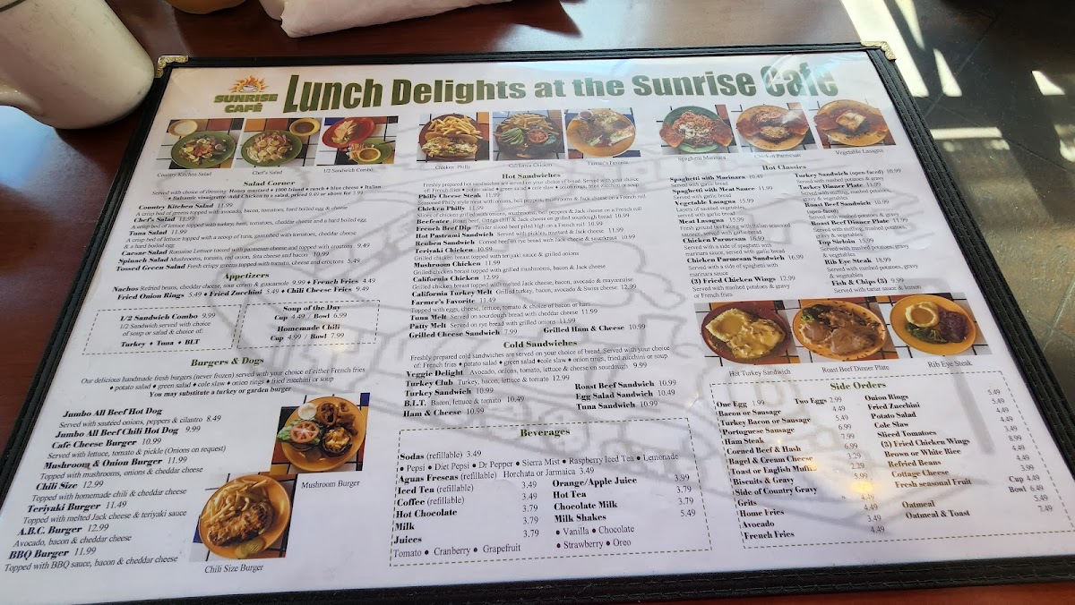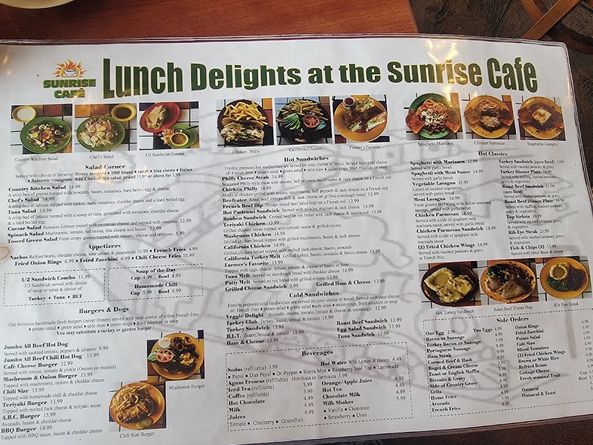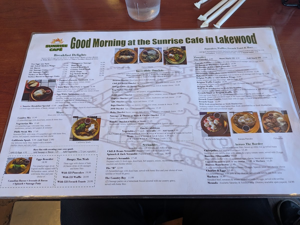 The menu at Sunrise Café - Lakewood offers a diverse selection of American-style breakfast and casual dining options, suitable for breakfast, brunch, or light meals throughout the day. The menu is organized into several groups, making it easy to find a variety of dishes and sides.