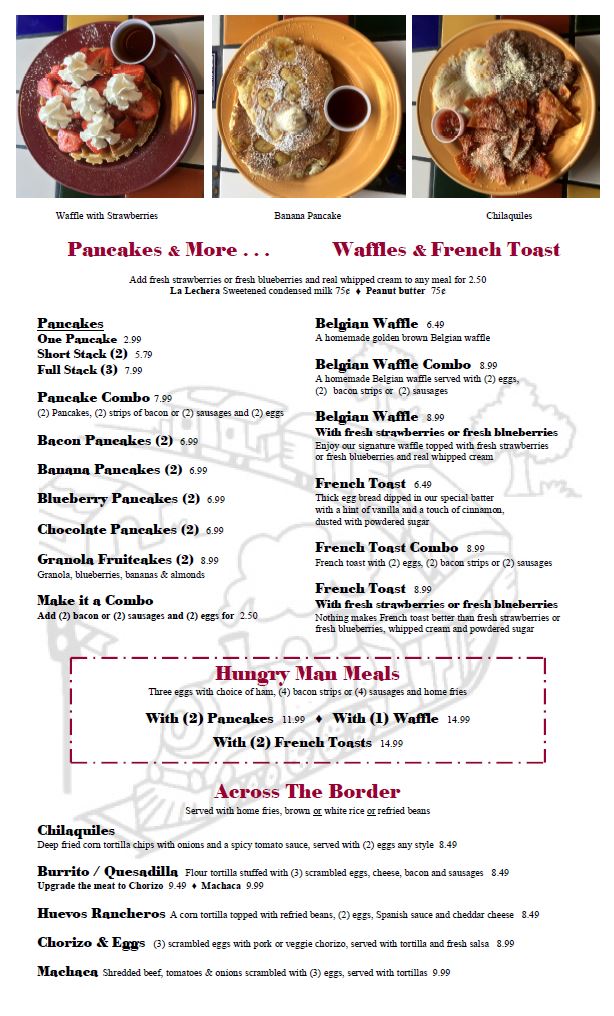 Additional Menu Highlights: Various sides and breakfast staples are also available, such as Country Gravy, Side Toast and Jam, Juice, Pancakes (including single and stacked options), Chicken Fried Steak, Fried Eggs, Fried Chicken, Vegetables Sautéed, Chilaquiles with Red or Green Sauce, Chorizo Scramble, and options to add strawberries and whipped cream to certain dishes.